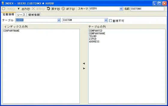 上段には対象となるテーブルの名前、インデックスとなる項目の順序を表示します。