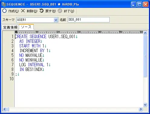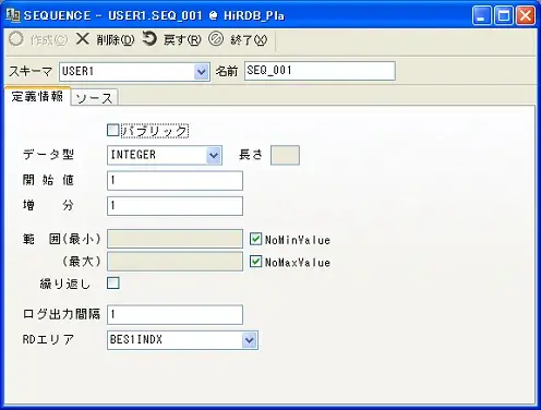 シーケンス(順序)オブジェクトの定義情報・ソースの表示及び保守を行う画面です。