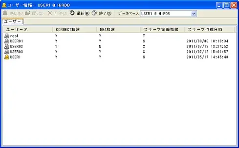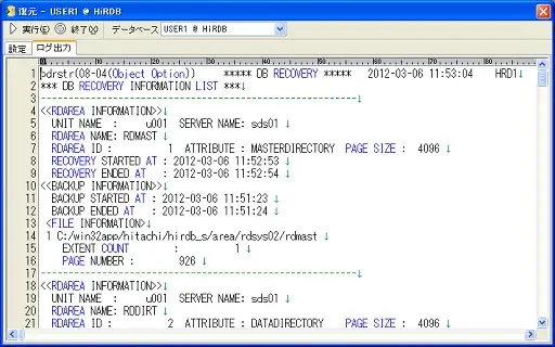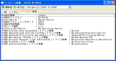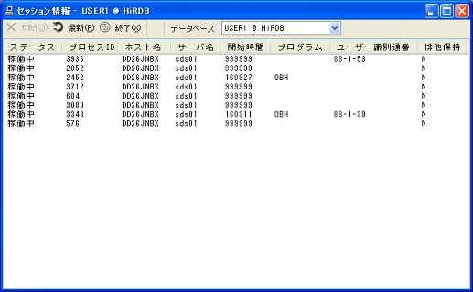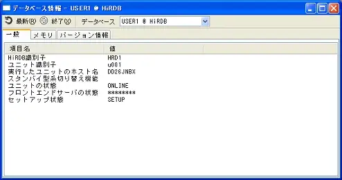 管理機能の事前設定についてユーザー情報画面を除く各管理機能(RDエリア情報・セッション情報・ロック情報・ データベース情報・バックアップ・復元・ロード)のご利用にあたっては、以下の制限がございます。 ①最初に「ログオン画面」にて、ホスト名とポート名を指定していただく必要が有ります。 ②また、コマンドの発行権限を使用するユーザーに付加する必要があります。 システム共通定義(pdsys)のpd_sql_command_exec_usersオペランドを指定してください。 <例> set pd_sql_command_exec_users \"root\",\"USER1\",\"USER2\" ③HiRDBクライアント環境定義ファイル( C:\WINDOWS\HiRDB.ini )に 接続情報(PDHOST・PDNAMEPORT・PDUSER)を設定してください。 |