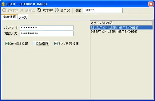 ※ただし、[ソース]タブではIDENTIFEIED BY句にあるパスワードは表示されていませんので、