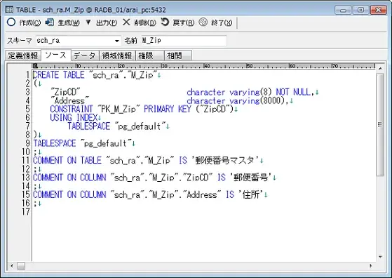 上段にはテーブルのコメントと、項目情報として項目名、型、全体桁数(,小数部桁数)、