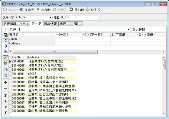 画面上段にある[条件]テキストボックスはデータの抽出条件を記述する事ができます。
