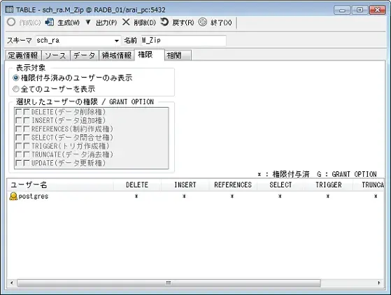 テーブルに従属する制約の名前、制約のタイプ(CHECK, UNIQUE, PRIMARY KEY, FOREIGN KEY, EXCLUDE)、制約の内容、状態を表示します。 (→ 4−7参照) |