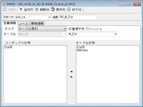 ]ボタンで重複不可となる項目を設定します。(主キー項目は必ず重複不可になります)