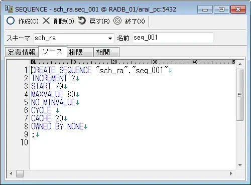 作成]ボタンを押すと、ALTER SEQUENCE文を発行します。ただし、最終番号を変更した場合はCREATE SEQUENCE文による再作成になります。