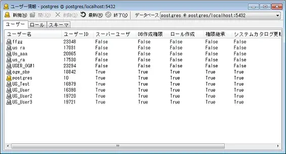 データベースに登録中のユーザー・ロール・スキーマを一覧表示します。