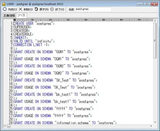 現在選択中のユーザー、ロール、スキーマの定義画面を表示します。