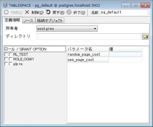 [所有権] [権限] [テーブルスペース] [セキュリティラベル] を選択することができます。