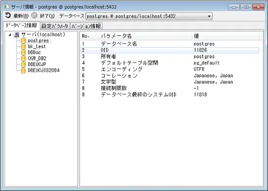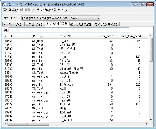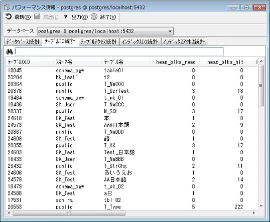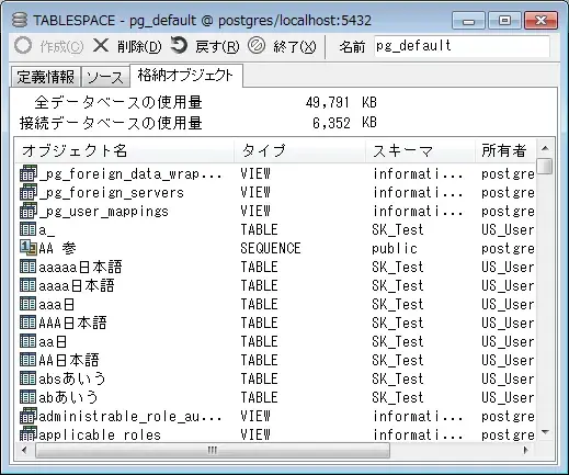 データベースで使用中のテーブルスペース情報を一覧表示します。