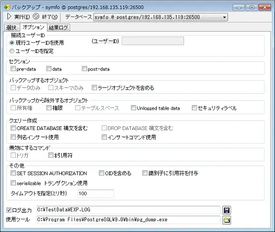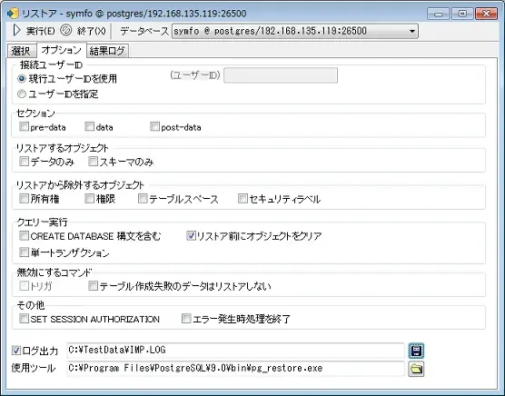 [CREATE DATABASE 構文を含む] [リストア前にオブジェクトをクリア] [単一トランザクション]