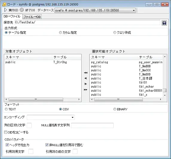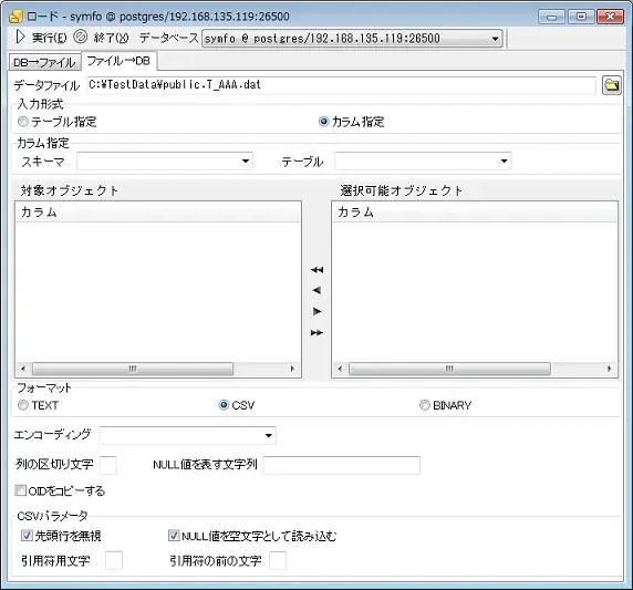 Symfoware版の制限Symfoware版では保存先/データファイルにて使用するディレクトリに 2バイト文字が使用されている場合は実行できない制限があります。 |