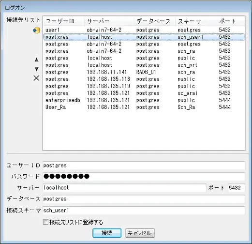 ユーザーID、パスワード、サーバー、ポート、データベース、接続スキーマ
