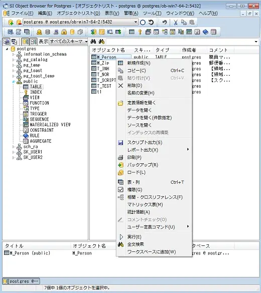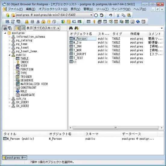 データベースに接続すると、そのスキーマが利用可能なデータベースオブジェクトが
