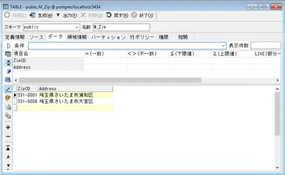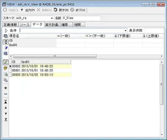 画面上段にある[条件]テキストボックスはデータの抽出条件を記述する事ができます。