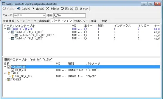画面下部のリストには上部リストにて選択したテーブルのトリガー・制約・インデックスを表示します。