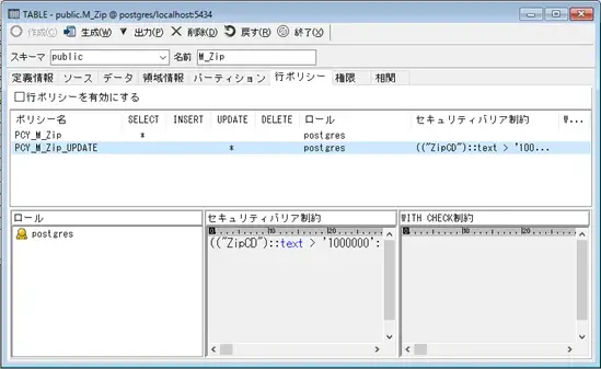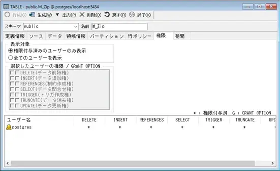 データ生成ツールを表示します。 (このボタンはテーブル、ビュー画面のみあります。) (→ 3−16参照) ※ビューの場合はVer9.3以上の場合にボタンが表示されます。 Ver9.2以下のビューは更新を許可するトリガー/ルールを 別途作成しないとビューの更新ができ無い為、 Ver9.2以下の接続時にはボタン自体を非表示としています。 |