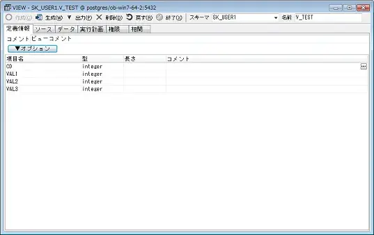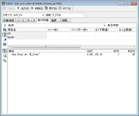 REFRESHコマンドを送信します。 (このボタンはマテリアライズドビュー画面にのみあります。) ※マテリアライズドビューの場合、最新データを表示するのに REFRESHコマンドを送信する必要があります。 また、WITH NO DATAオプションを付与する場合も使用します。 |
