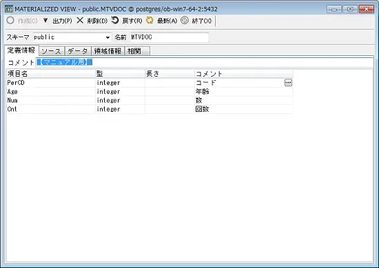 マテリアライズドビューのコメントと、項目情報として項目名、型、全体桁数(,小数部桁数)、