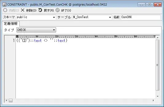 チェック制約のためのソースを記述します。初めと終わりは括弧を入力します。