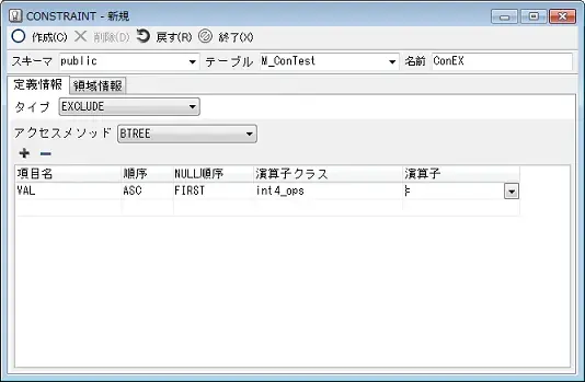 排他制約を作成します。指定した演算子を満たす行は、テーブル中に1行しか存在できません。