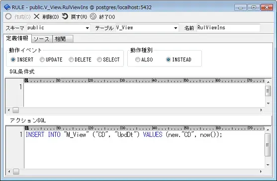 SELECTを選択した際は 名前は"_RETURN"、動作種別はINSTEAD、SQL条件式は無し、