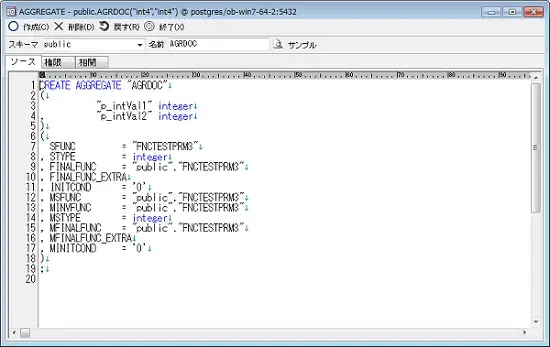 サンプル]ボタンを押すと、サンプルコードを参照することも出来ます。サンプルコードを参照することで、AGGREGATE構文の記述がわかります。